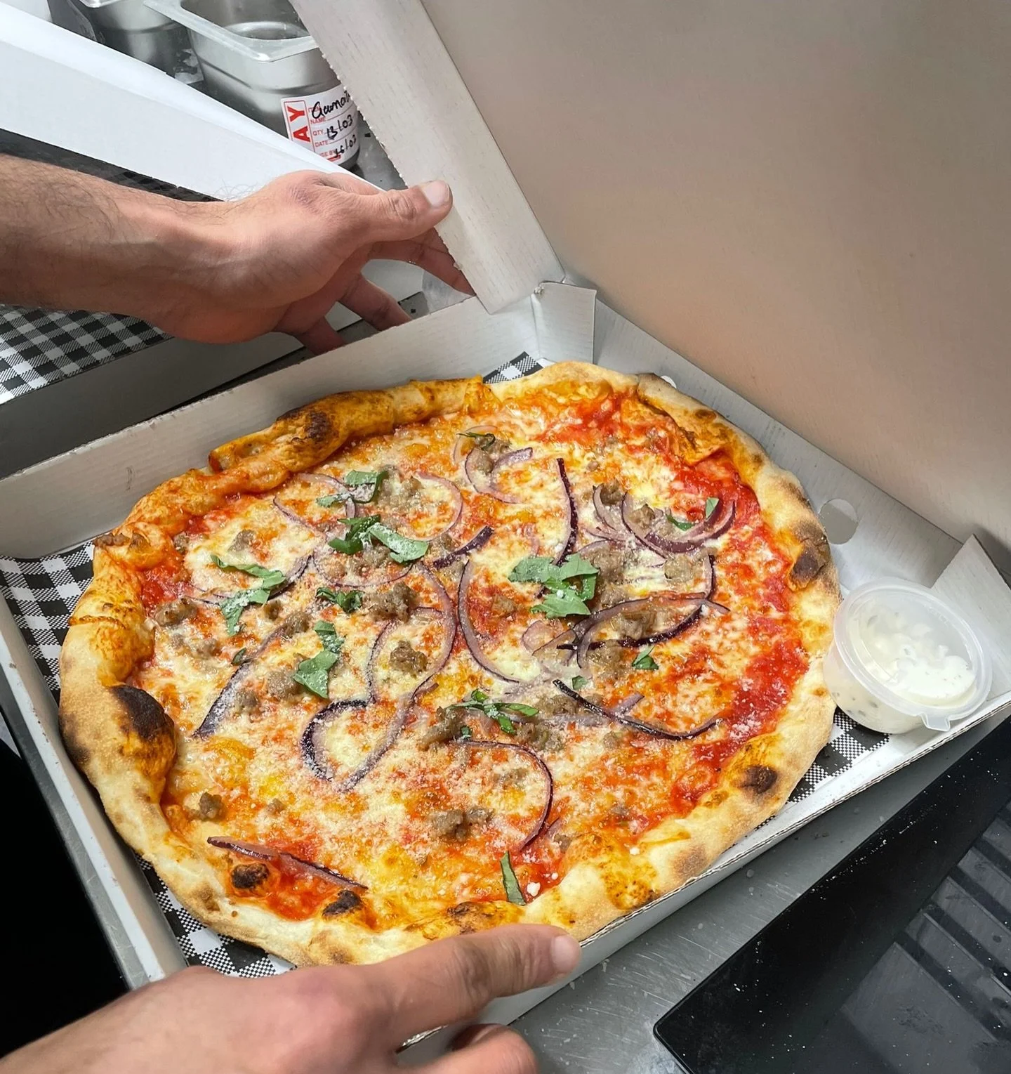 tomato sauce, aged mozzarella, fennel pork sausage, onions, pecorino, fresh basil